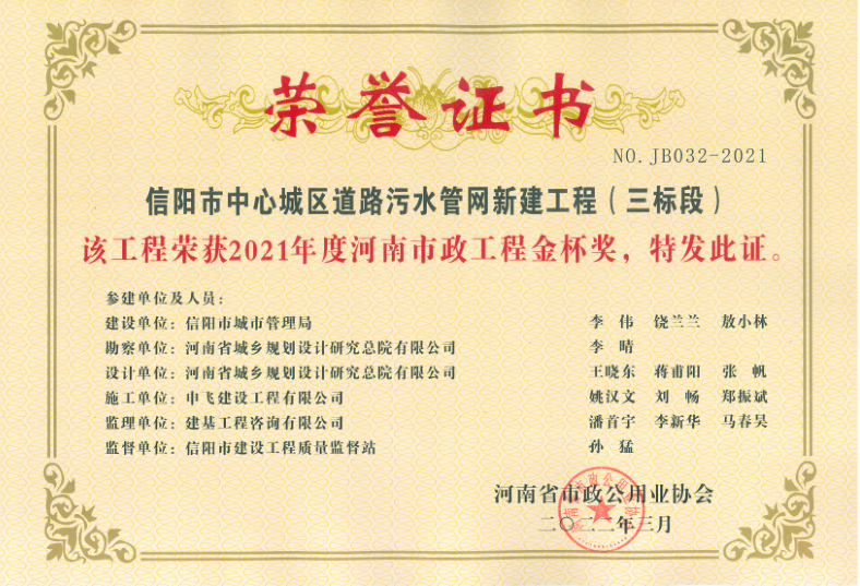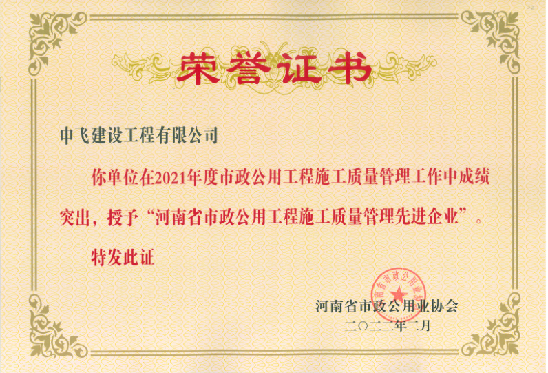 信陽(yáng)市申飛市政工程有限公司原名信陽(yáng)市市政工程公司,注冊(cè)資本1.1億元。公司目前擁有“市政公用工程總承包一級(jí)、市政設(shè)計(jì)乙級(jí)、房屋建筑總承包三級(jí)、環(huán)保三級(jí)、機(jī)電安裝三級(jí)、裝飾裝修三級(jí)、鋼結(jié)構(gòu)三級(jí)”等多項(xiàng)企業(yè)資質(zhì)。公司下設(shè)設(shè)計(jì)公司、物業(yè)公司、商品砼公司等多個(gè)子公司。業(yè)務(wù)范圍包括市政工程設(shè)施管理,城市道路、橋梁和隧道施工、維護(hù),城市給水、排水設(shè)施施工及維護(hù),城市道路、橋涵測(cè)量、設(shè)計(jì),建筑工程,燃?xì)鉄崃?、垃圾處理,預(yù)制構(gòu)件,建筑垃圾運(yùn)輸、處置、加工再利用,園林工程,商品砼的生產(chǎn)與銷(xiāo)售等。